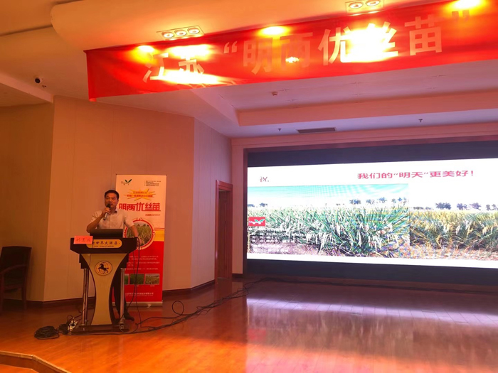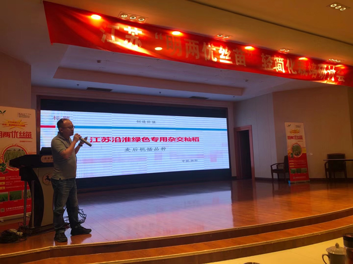 接著由盧偉林經(jīng)理向參會(huì)代理商、種植大戶、育秧合作社代表介紹明兩優(yōu)絲苗的特征特性以及最近幾年各縣市種植田間表現(xiàn)情況。盧經(jīng)理介紹到隨著土地流轉(zhuǎn),種植大戶越來越多,雜交水稻移栽成本居高不下、人工緊缺,大戶用工難、收益低。明兩優(yōu)絲苗的生育期、抗倒性、抗病性及產(chǎn)量結(jié)構(gòu)就特別適合當(dāng)下種植大戶和育秧合作社做雜交稻機(jī)插種植。因此雜交水稻的輕簡(jiǎn)化栽培勢(shì)不可擋,明兩優(yōu)絲苗應(yīng)勢(shì)而出,適時(shí)填補(bǔ)了江蘇淮北雜交水稻機(jī)插合法品種的空白。同時(shí)詳細(xì)介紹了明兩優(yōu)絲苗的栽培管理措施。